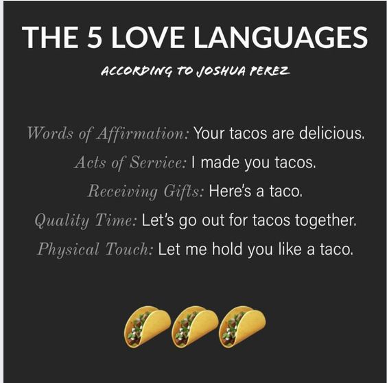 Happy Taco Tuesday! I recently saw a meme online explaining The 5 Love Languages in terms of tacos. Of course, as soon as I saw it I had to share it with my friend Monica who enjoys all things taco, plus I personally thought it was cute and funny. The more I thought about it though, the more I realized that the taco metaphor was really a great way to explain my own relationship with The 5 Love Languages.