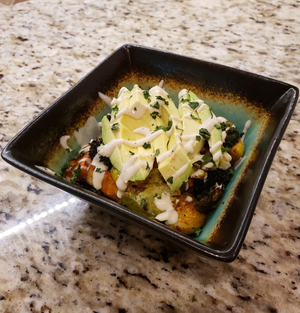 Credit: Forkly 1 large sweet potato, cubed ½ large red onion, wedge sliced 2 zucchini, diced 1 can kernel corn, drained 1 can chickpeas, drained Olive oil Salt & Pepper to taste MOROCCAN SEASONING: 1 tsp each – cumin, chili powder, garlic powder, turmeric, plus ¼ tsp salt and pepper (or to taste) TAHINI SAUCE: ¼ cup tahini, 1 Tbsp maple syrup, 1 Tbsp lemon juice, 2-4 Tbsp water (I often substitute a tiny bit of honey for the maple syrup, or leave it out entirely) Avocado halves, sliced 4 cups cooked brown rice (or other grain) – I usually don’t make this much, I usually make 2 cups 1. Preheat oven to 400 degrees Fahrenheit 2. Microwave the cubed sweet potato 2 minutes to soften before roasting (do not leave this step out. Alternately you can start roasting the sweet potatos first, and then add the rest of the vegetables later; this will add ~10 minutes to your total cooking time.) 3. Place the sweet potato, red onion, zucchini, corn in a bowl and drizzle with olive oil, and salt and pepper to taste, and toss to coat. Place on a sheet pan. 4. Using the same bowl, add the chickpeas and drizzle with olive oil and the Moroccan seasoning, and toss to coat. Add to the rest of the vegetables on the sheet pan. 5. Make sure the vegetables are spread evenly in one layer on the sheet pan to ensure they roast evenly; if you need to, use 2 sheet pans. 6. Bake for 25-30 minutes or until vegetables are roasted to your liking. Stir/turn the vegetables half way through cooking for more even roasting. 7. While the vegetables are roasting, make the tahini sauce: a. Combine tahini, maple syrup, lemon juice, and 2 Tbsp water in a bowl. It will get thick. b. Add more water 1 Tbsp at a time to thin the dressing until it is the desired consistency. c. I often add a sprinkling of cumin and paprika to the dressing. 8. Add cooked grains to a bowl and spoon the roasted vegetables on top. 9. Top with fresh avocado slices and drizzle with tahini sauce.Ingredients